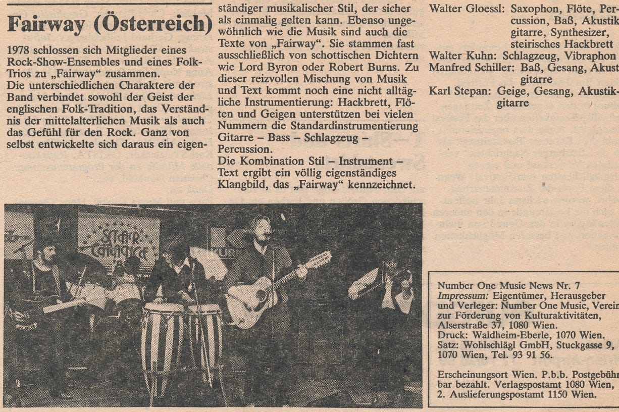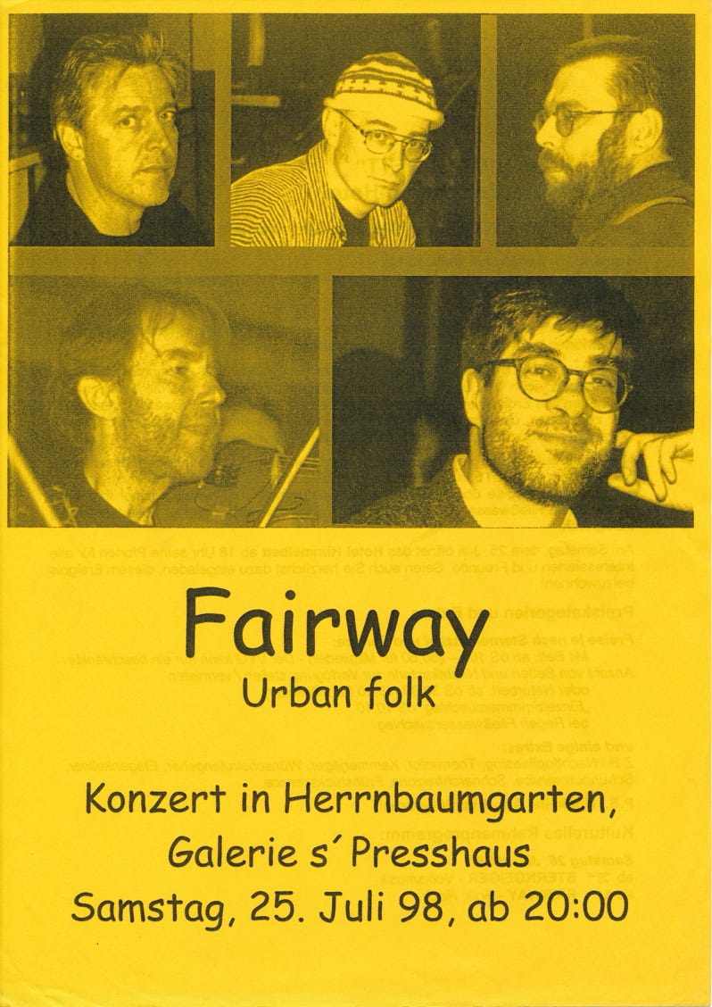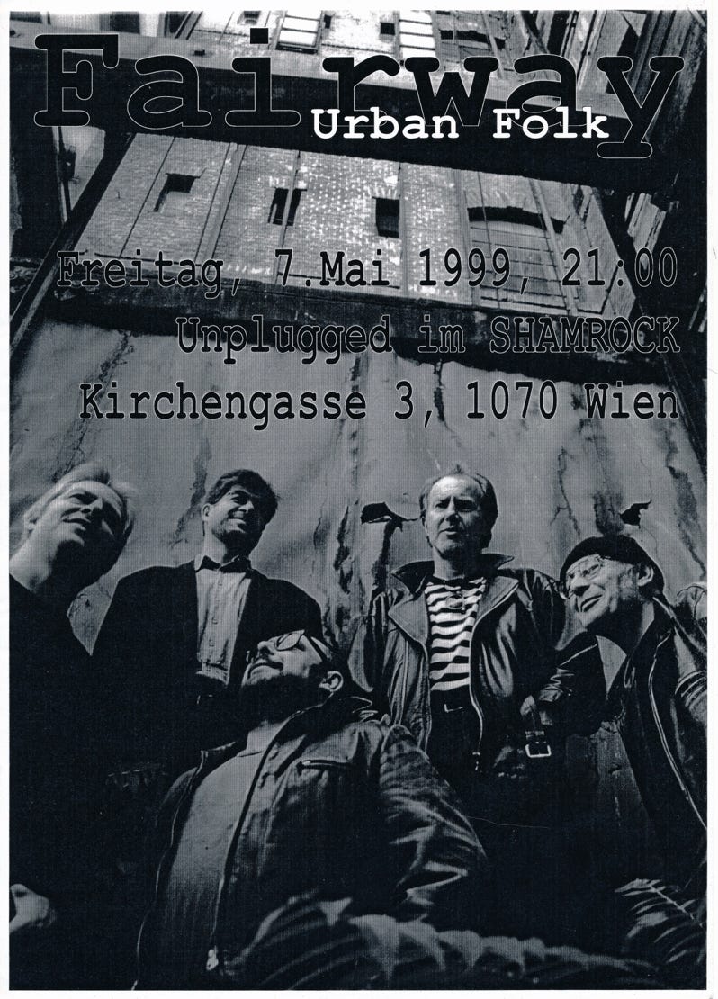 „Die Wiener Band FAIRWAY verfolgt das Konzept, klassische und zeitgenössische englischsprachige Lyrik mit eigenen Kompositionen und Arrangements zu vertonen. Die musikalische Umsetzung der Musik erfolgt in erdigen, durch die englische Canterbury-Szene und dem schottisch-irischen bis hin zum bretonischen Folk beeinflussten Arrangements. Auf ihren Alben hat die Band u.a. immer wieder Lyrik, frei nach Charles Bukowski vertont. In der auftrittslosen Zeit während der Pandemie kam die Idee auf, sich von Charles Bukowskis Lyrik inspirieren zu lassen, daraus Wienerische Texte zu kreieren und mit eigener Musik zu vertonen. Im ersten Teil unseres neuen Programms bringen wir Kostproben von diesem Projekt. Anschließend gibt es bekannte und beliebte „klassische“ FAIRWAY-Nummern quer durch die Historie der Band.“