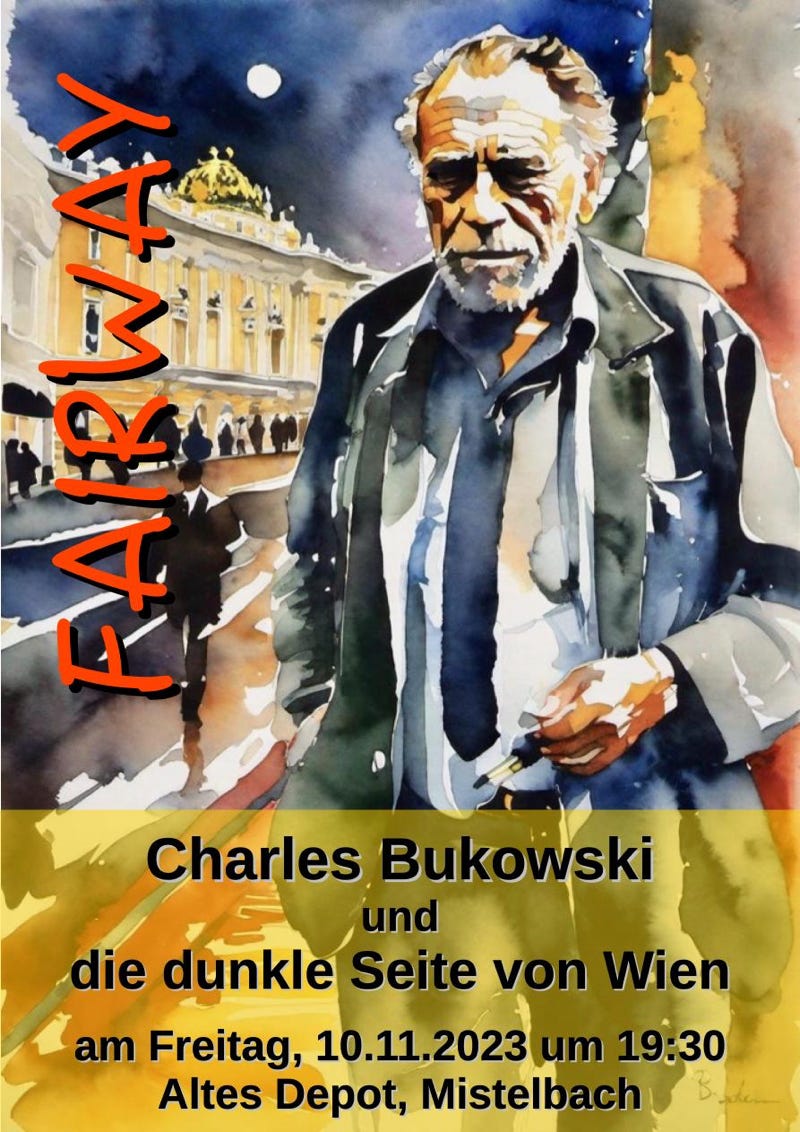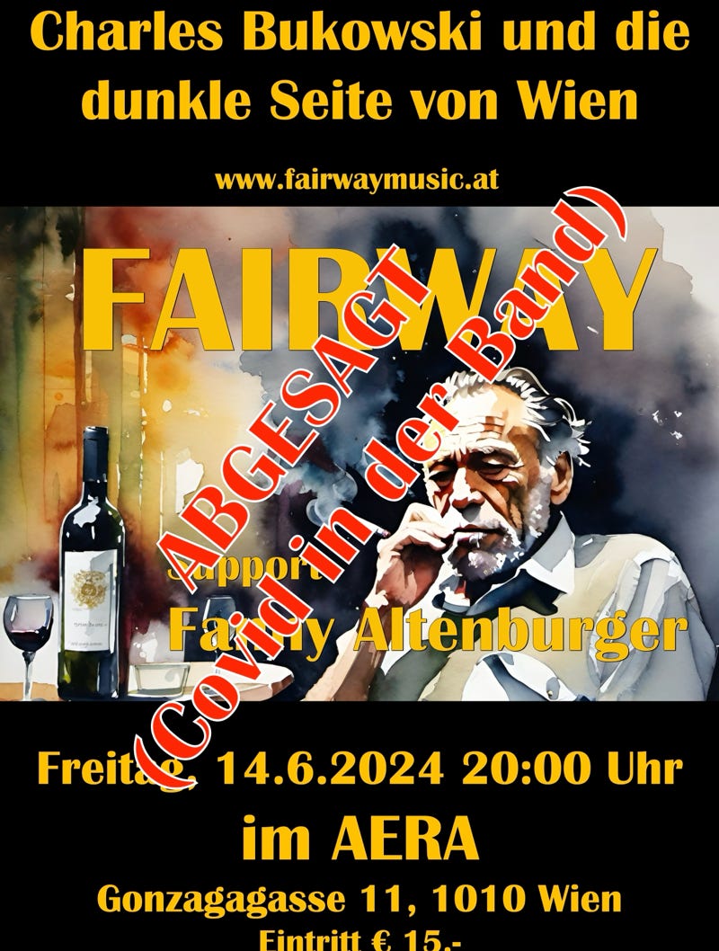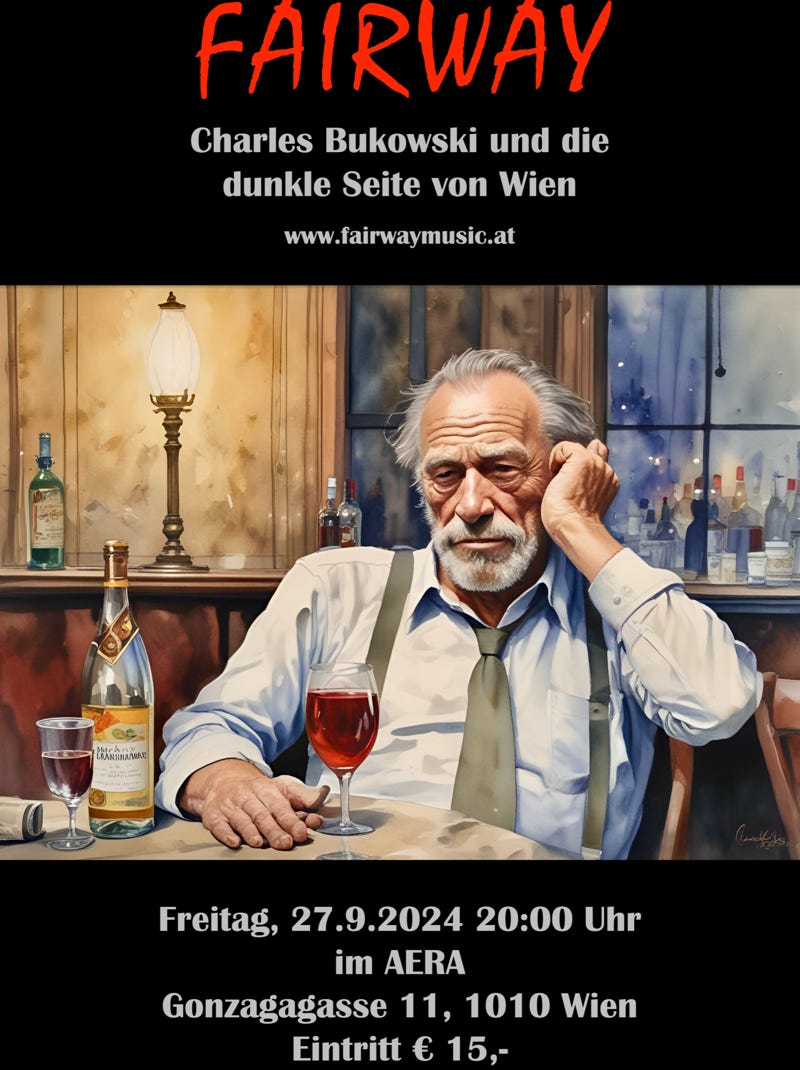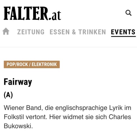 „Nach längerer Zeit ist die Band FAIRWAY wieder im Alten Depot zu Gast und wird diesmal zwei völlig unterschiedliche Sets spielen. Der erste Teil des Konzerts ist eine Premiere und steht unter dem Motto: „Charles Bukowski und die dunkle Seite von Wien.“ Die Vorgeschichte: FAIRWAY hat auf ihren Alben immer wieder Lyrik, frei nach Charles Bukowski vertont. In der auftrittslosen Zeit während der Pandemie kam die Idee auf, sich von Bukowskis Lyrik inspirieren zu lassen, daraus Wienerische Texte zu kreiren und mit eigener Musik zu vertonen. Im ersten Set spielt FAIRWAY erstmals vor Publikum diese neuen, auf Wienerisch gesungenen Nummern! Im zweiten Teil gibt es dann bekannte und beliebte „klassische“ FAIRWAY-Nummern.“