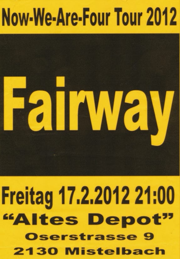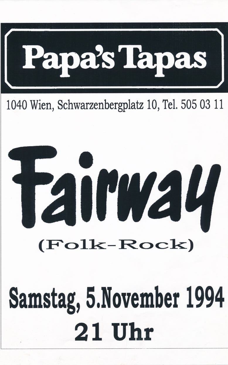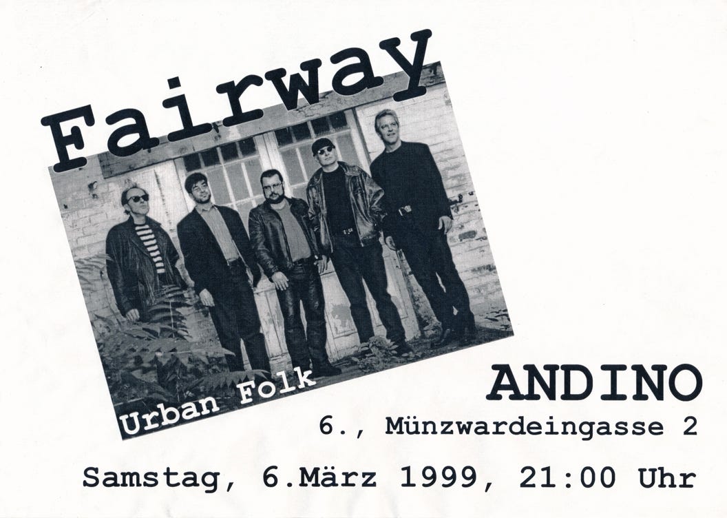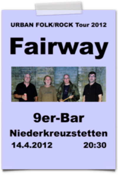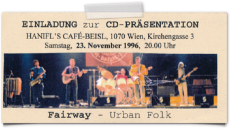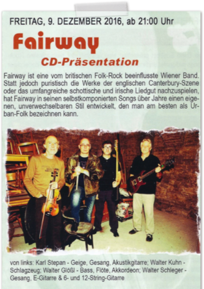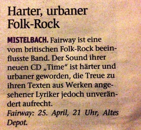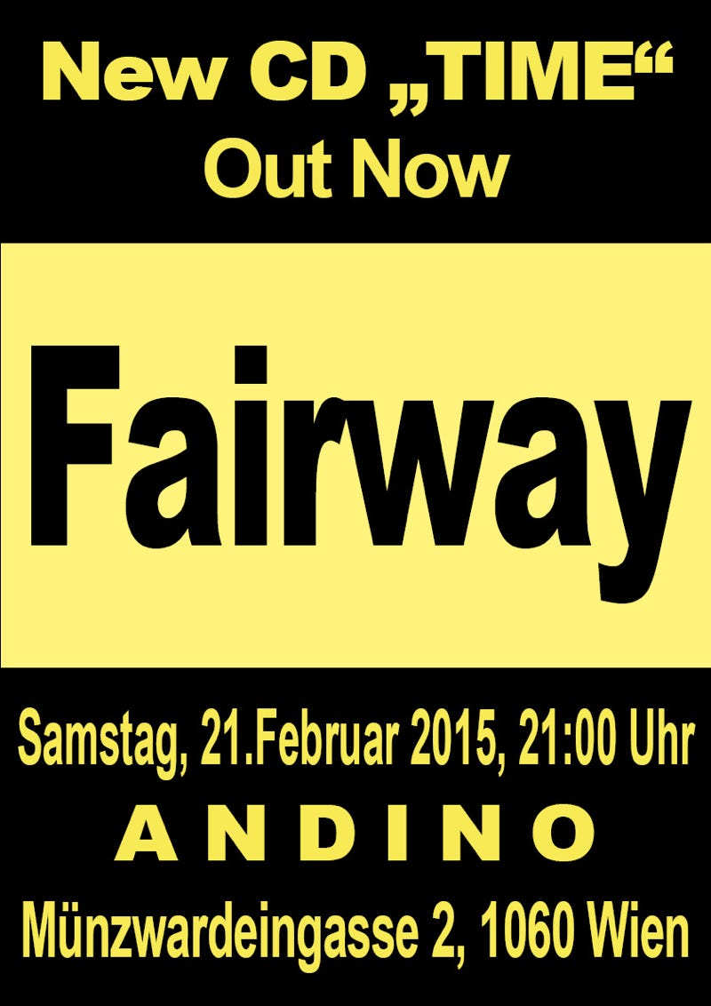 „FAIRWAY präsentieren live ihre brandneue CD "Time" zu ihrem nunmehr 34-jährigen Bestehen. Der Sound ist härter und urbaner geworden, die Treue zu ihren Texten aus Werken angesehener LyrikerInnen quer durch die Jahrhunderte wie Lord Herbert of Cherbury, W.H.Auden, William Butler Yeates oder John Donne ist aber unverändert aufrecht.“