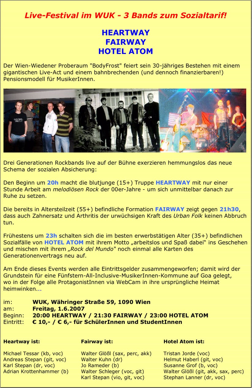 Der Wien-Wiedener Proberaum „BodyFrost“ feiert sein 30-jähriges Bestehen mit einem gigantischen Live-Act und einem bahnbrechenden (und dennoch finanzierbaren!) Pensionsmodell für MusikerInnen.