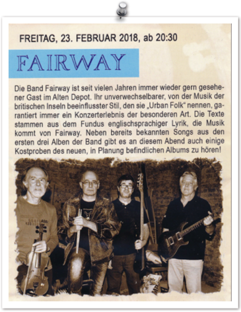 Die Band FAIRWAY ist seit vielen Jahren immer wieder gern gesehener Gast im Alten Depot. Ihr unverwechselbarer, von der Musik der britischen Inseln beeinflusster Stil, den sie „Urban Folk“ nennen, garantiert immer ein Konzerterlebnis der besonderen Art. Die Texte stammen aus dem Fundus englischsprachiger Lyrik, die Musik kommt von FAIRWAY. Neben bereits bekannten Songs aus den ersten drei Alben der Band gibt es an diesem Abend auch einige Kostproben des neuen, in Planung befindlichen Albums zu hören!